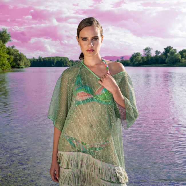 DEBUSSY est bien plus qu’une simple robe de plage. Avec son ouverture fendue et son tour de cou orné de dorures couleur or mat, elle incarne le luxe décontracté, parfait pour flâner au bord de l’eau avec style.
